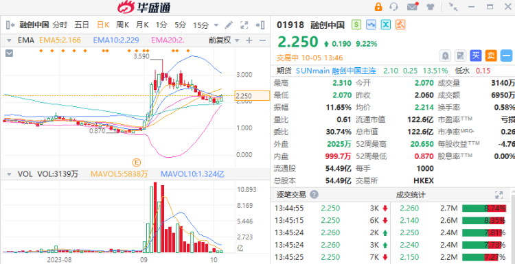 融创中国(01918)一度涨超12%,截至发稿,涨8.74%,报2.24港元,成交额6837.79万港元。