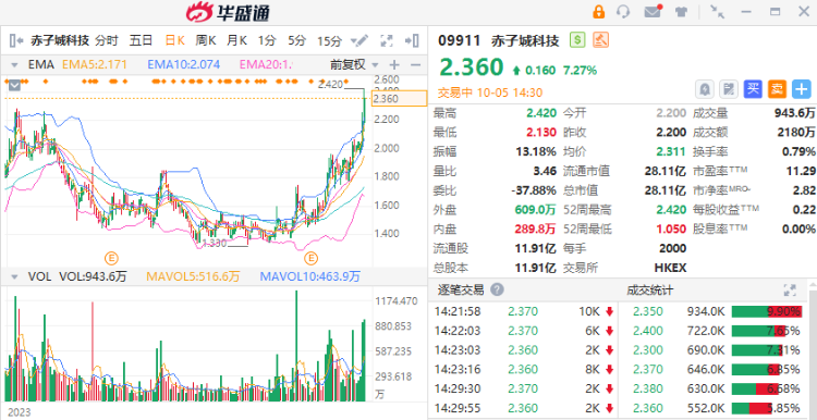 10月5日讯,赤子城科技(09911)续升10%,高见2.42港元创2022年7月份以来新高。截至发稿,涨7.27%,报2.36港元,成交额2180万港元。