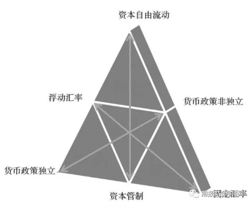 “不可能三角”理论是经济学家蒙代尔在20世纪60年代提出的,它阐述了独立的货币政策、固定汇率和资本流动性之间的矛盾关系。理论的内容是——对于一个处在经济发展进程中的国家来说,有三点是永不可能同时实现的,即固定的汇率水平、国际间资本自由流动、保证独立的货币政策。换言之,就是三项目标不能同时实现,必须要牺牲其中一项才能满足另外两项。如果一个国家或者经济体允许资本自由流动,又要求拥有独立的货币政策,就难以保持汇率的稳定;如果要求汇率稳定和资本流动,那么就必须放弃独立的货币政策。