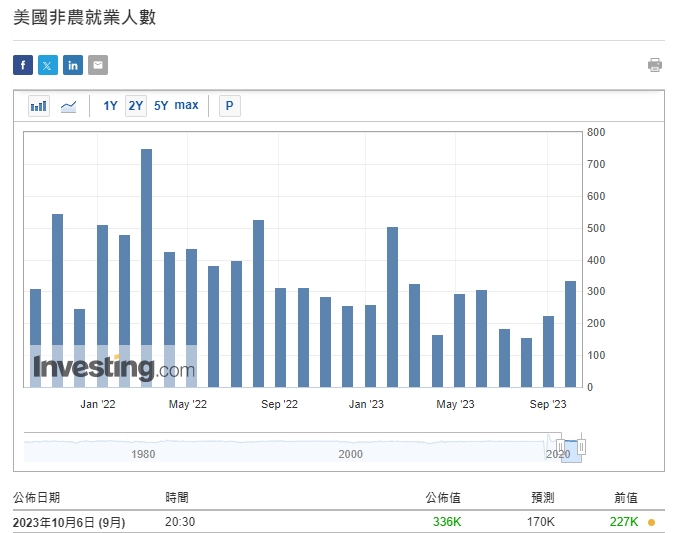 美国劳工部公布9月份非农就业新增职位增加33.6万个,远多过预期17万个,及上月经修订后的22.7万个。同月份失业率维持在3.8%,略高预期3.7%,唯跟8月持平。月内平均时薪按年升4.2%,稍低预期4.3%。按月同升0.2%,亦同低预期0.3%。