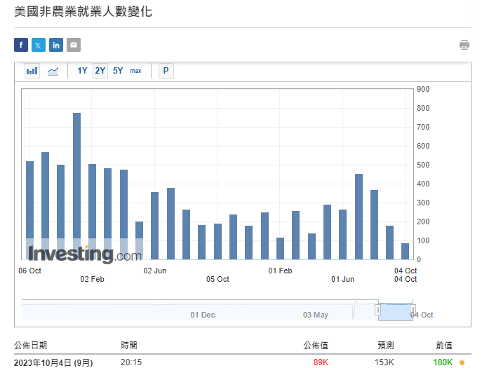 9月份ADP就业人数仅增加8.9万,远少过预期15万及上月经修订后的18万。并创自2021年1月以来最低。 8月份JOLTS 职位空缺增加69万个至961万个,远多过预期880万个,及上月892万个。数据反映劳工市场仍然强劲,因此估计利率需要在高位更长时间。