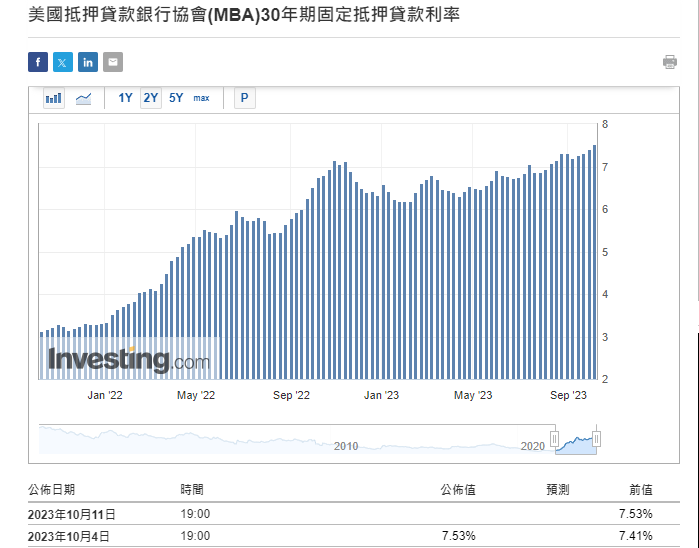 9月份供应管理协会ISM非制造业指数报53.6,符合预期,但低过上月54.5。美国抵押贷款银行协会公布周内30年期定息按揭由上星期的7.41厘升至7.53厘。创出自2000年11月以来最高,更连升4个星期。