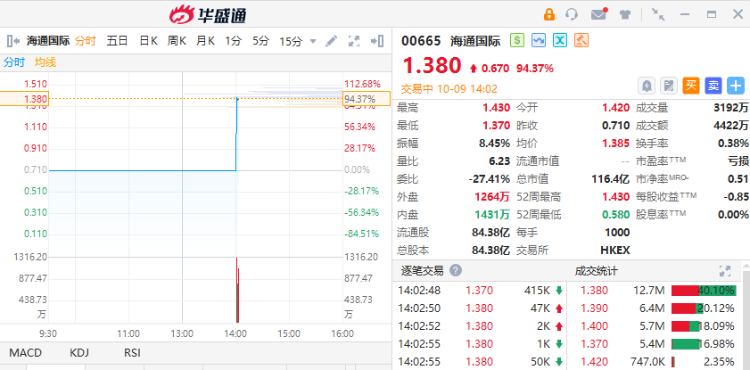 10月9日,海通国际复牌后股价大涨,截至发稿,海通国际涨超94%,报1.38港元,成交额4422万港元。