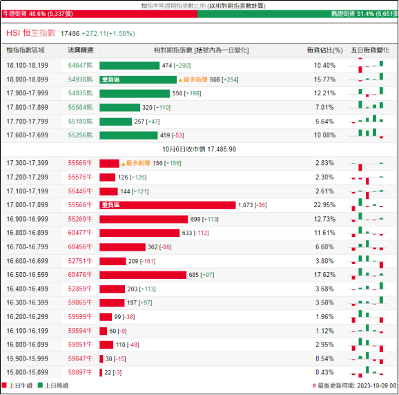 街货分布方面,至上周五,恒指牛证街货重货区间主要在收回价16500点至17100点之间,累计相当约3,661张期指合约;恒指熊证街货重货区主要在收回价17600点至18200点,累计相当约2,200张期指合约。