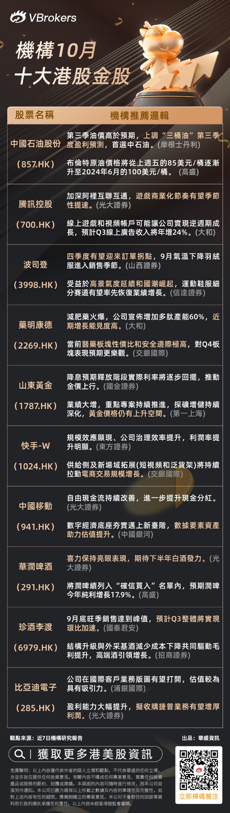 华盛资讯10月10日讯,国内十一长假落幕,随着南下资金通道重启,港股正式进入年内第四个季度。本文根据光大证券、浙商证券等多家大行机构研究报告,为各位投资者整理了10月的10只港股金股及机构推荐逻辑: