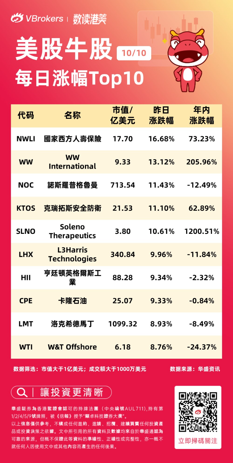 發仔梳理了每日美股涨幅Top10榜单,以下为隔夜美股涨幅靠前的个股: