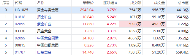 华盛资讯10月9日消息,港股黄金股午后异动拉升,截至发稿,招金矿业涨超5%,紫金矿业涨超4%,灵宝黄金涨超3%,中国黄金国际、中国白银集团、山东黄金涨近3%。