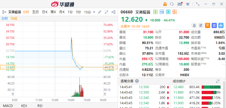 10月9日,港股艾美疫苗开盘大跌,截至发稿,该股跌44.41%,报12.62港元,成交额8563万港元,最新总市值152.8亿港元。