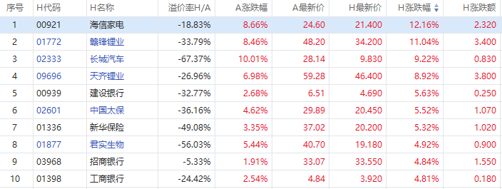 截至发稿,海信家电A股涨8.66%,H股涨12.16%;赣锋锂业A股涨8.46%,H股现涨11.04%;长城汽车A股涨停,H股涨9.22%。