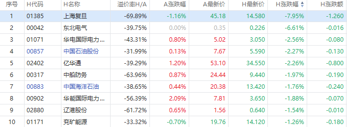 上海复旦A股跌1.16%,H股跌7.95%;华能国际电力股份A股涨0.8%,H股现跌2.56%;中国石油股份A股涨0.13%,H股跌2.27%。