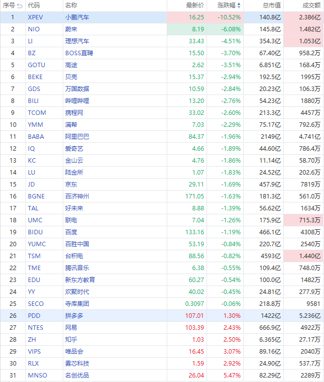 BOSS直聘 $BZ 、高途 $GOTU 跌超3%,哔哩哔哩 $BILI 跌超2%,阿里巴巴 $BABA 、京东 $JD 跌超1%;