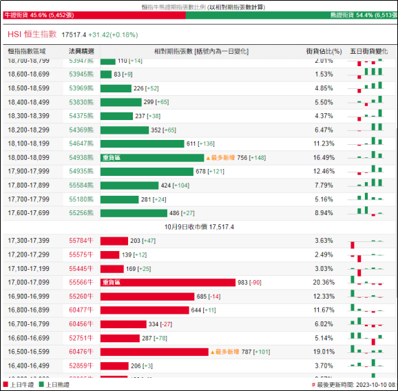 街货分布方面,至周一,恒指牛证街货重货区间主要在收回价16500点至17100点之间,累计相当约3,720张期指合约; 恒指熊证街货重货区主要在收回价17600点至18200点,累计相当约3,245张期指合约。