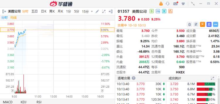 10月10日,美图公司涨超9%,高见3.81港元,成交额2.415亿港元。