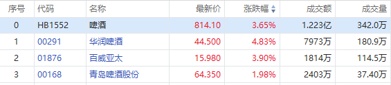啤酒股延续反弹,截至发稿,华润啤酒(00291)涨4.83%,报44.5港元;百威亚太(01876)涨3.9%,报15.98港元;青岛啤酒股份(00168)涨1.98%,报64.35港元。