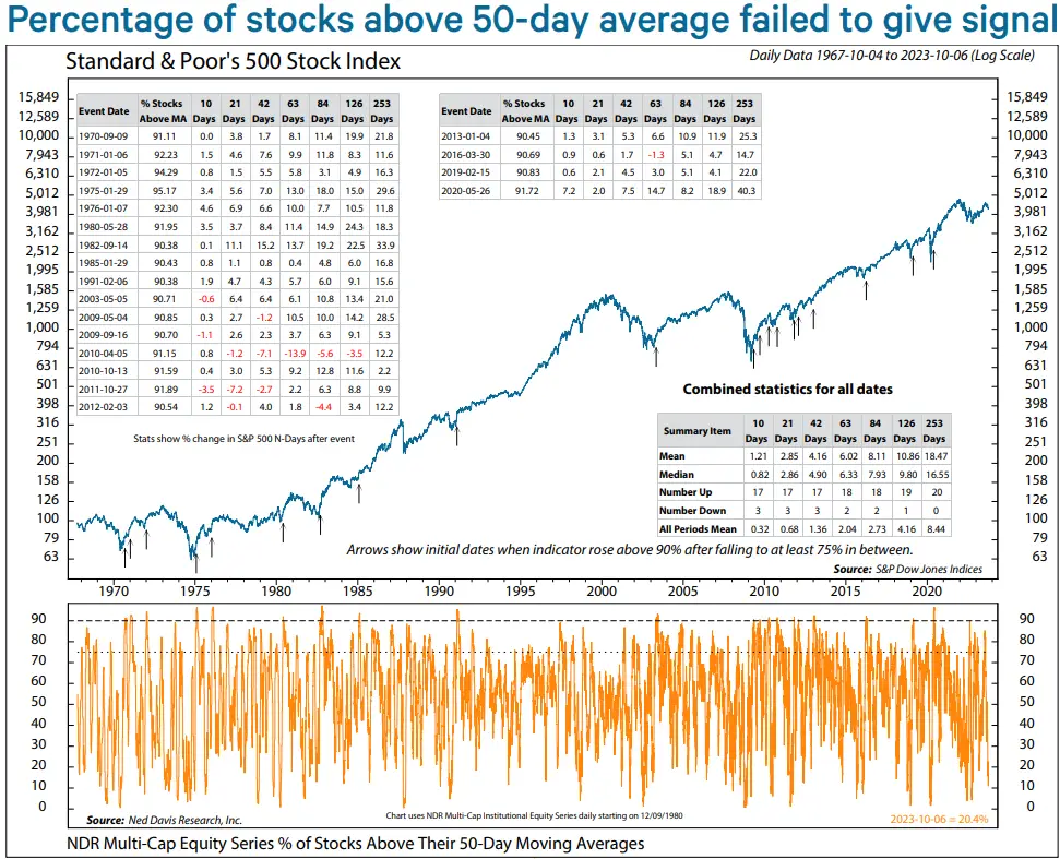 “在这轮牛市的早期,我们确实得到了大幅推动,但股票买入比例超过50日移动均线的情况还从未出现过。在1987年也出现过这种情况,但在牛市中这种‘启动失败’仍是非常罕见的。”