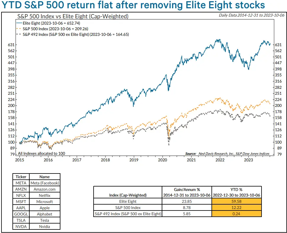 如果剔除亚马逊、苹果、Alphabet和英伟达等8只大型科技股,标普500指数今年迄今的回报率持平。该报告称,标普500指数的其他492只成分股大多表现平平。这在新一轮牛市中通常不会发生。