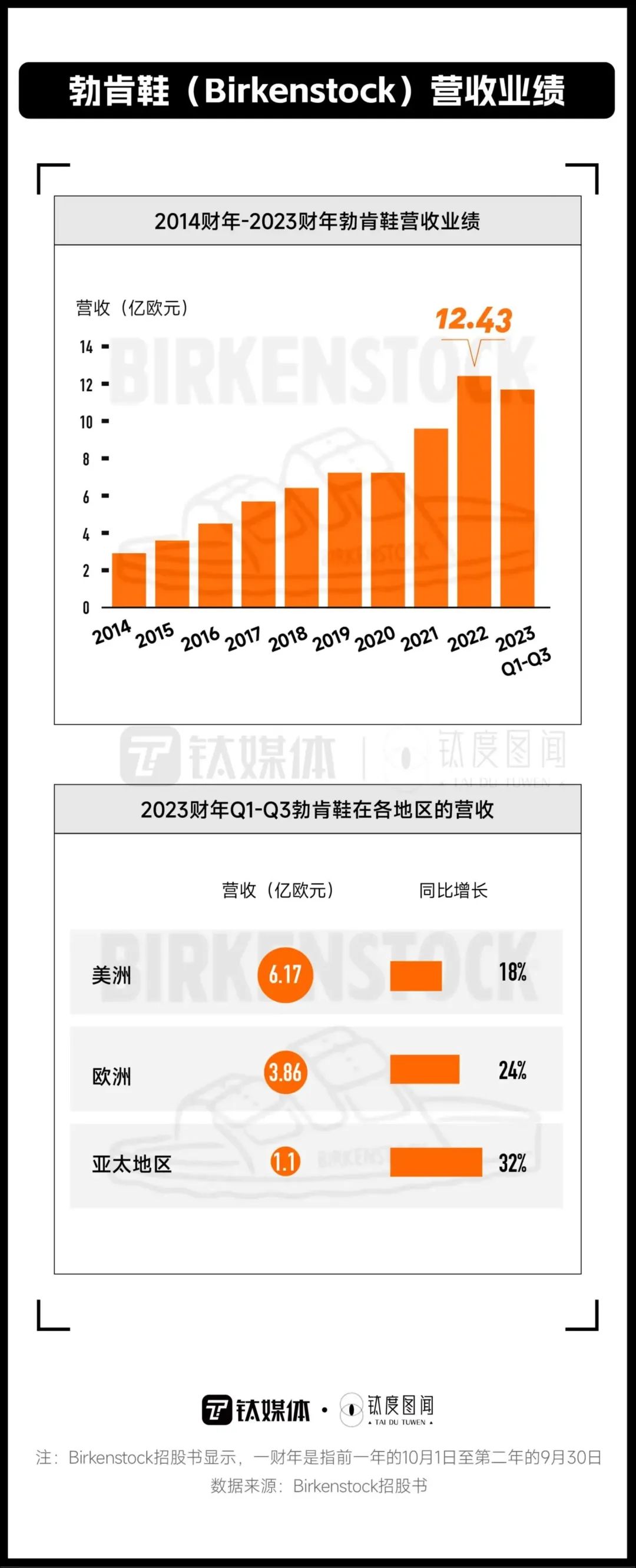据Birkenstock招股书透露,2014财年该品牌的营收业绩为2.92亿欧元(约合22.15亿人民币),而到2022财年营收业绩直接翻2番达到12.43亿欧元(约合94.3亿人民币);而在2022年10月1日到2023年6月30日的三个季度间,Birkenstock营收业绩达11.71亿欧元(约合90.31亿人民币),同比增长21.3%,已经是2022财年总营收的94.2%。