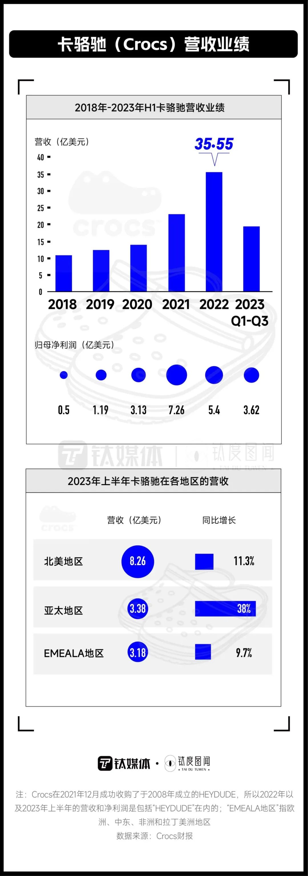 同样交出满意答卷的还有洞洞鞋的母公司卡骆驰(Crocs)。财报数据显示,在2018年-2022年间,卡骆驰公司营收直线上涨,5年间其营收从10.88亿美元增加到35.55亿美元,增幅达226.7%。2023年上半年,卡骆驰实现营收19.56亿美元,同比增长20.4%。在净利润方面,2021年卡骆驰净利润达7.26亿美元,是2018年0.5亿净利润的14倍。