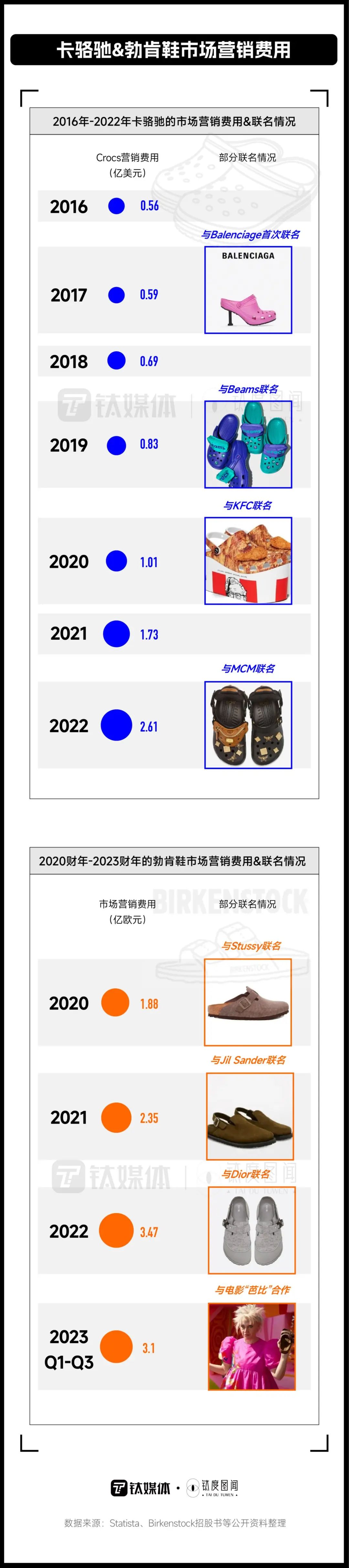 除此之外,卡骆驰近年来的营销也没落下。近年来,卡骆驰相继官宣各流量明星成为代言人,在明星效应的影响下,更多人对洞洞鞋产生了兴趣,加速了洞洞鞋的火爆。此外,卡骆驰的不断联名也加快了洞洞鞋的流行。2017年,卡骆驰首次跟巴黎世家联名,推出了“恨天高”版洞洞鞋;此后多年间,卡骆驰先后与迪士尼、哈利波特、KFC、MCM等不同名牌及IP联名,打造出多款现象级的联名洞洞鞋,让洞洞鞋再次翻红。数据显示,2016年卡骆驰用在市场营销方面的费用为0.56亿美元,而这一数字在7年后的2022年上涨近5倍,达到2.61亿美元。