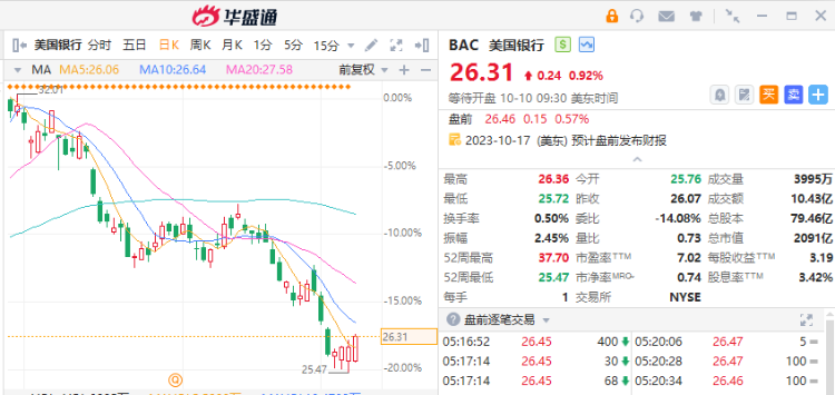 上周,美银股价创下了近三年来的最低水平。周一(10月9日),美银股价收涨0.92%,于每股23.31美元。