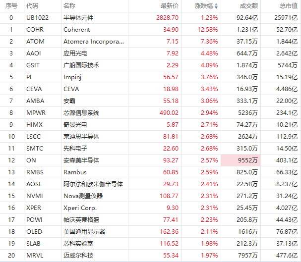 华盛资讯10月10日消息,美股半导体板块异动走高,3倍做多半导体指数ETF $SOXL 涨超3%;Coherent $COHR 涨超12%,应用光电 $AAOI 涨超4%,芯源信息系统 $MPWR 、安森美半导体 $ON 涨超2%,迈威尔科技 $MRVL 、恩智浦 $NXPI 、美国超微公司 $AMD 、博通 $AVGO 、英伟达 $NVDA 、 $ARM 涨超1%;高通 $QCOM 跟涨。