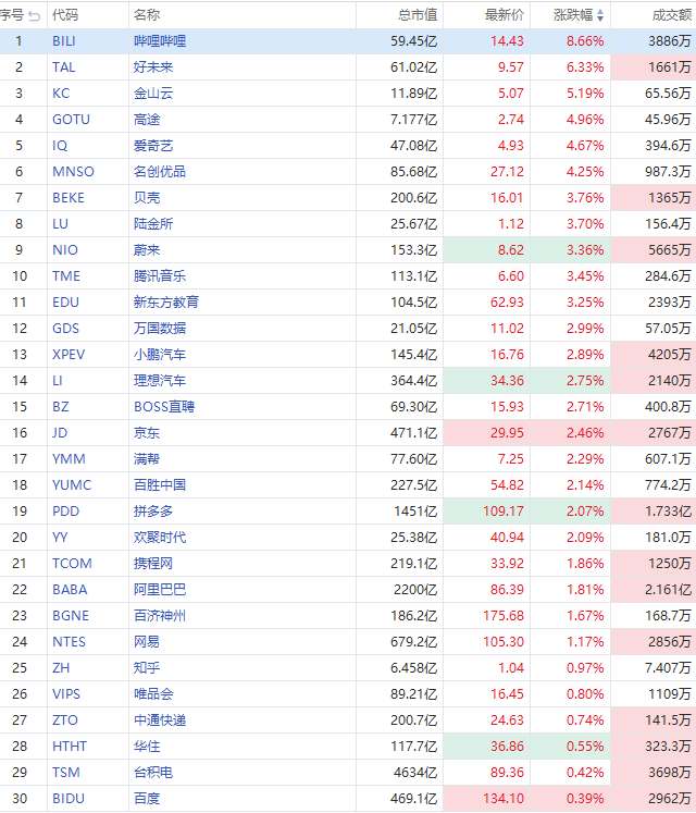 哔哩哔哩 $BILI 涨超8%,金山云 $KC 涨超5%,爱奇艺 $IQ 、名创优品 $MNSO 涨超4%;贝壳 $BEKE 涨超3%;BOSS直聘 $BZ 、拼多多 $PDD 、京东 $JD 涨超2%,阿里巴巴 $BABA 、网易 $NTES 涨超1%,知乎 $ZH 跟涨。