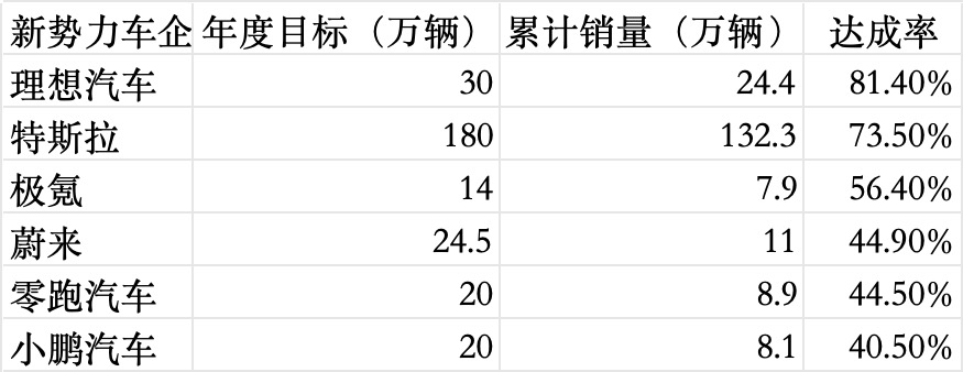 不过相较于传统车企,多家造车新势力全年销量完成情况普遍不算乐观,达成率尚不足6成。