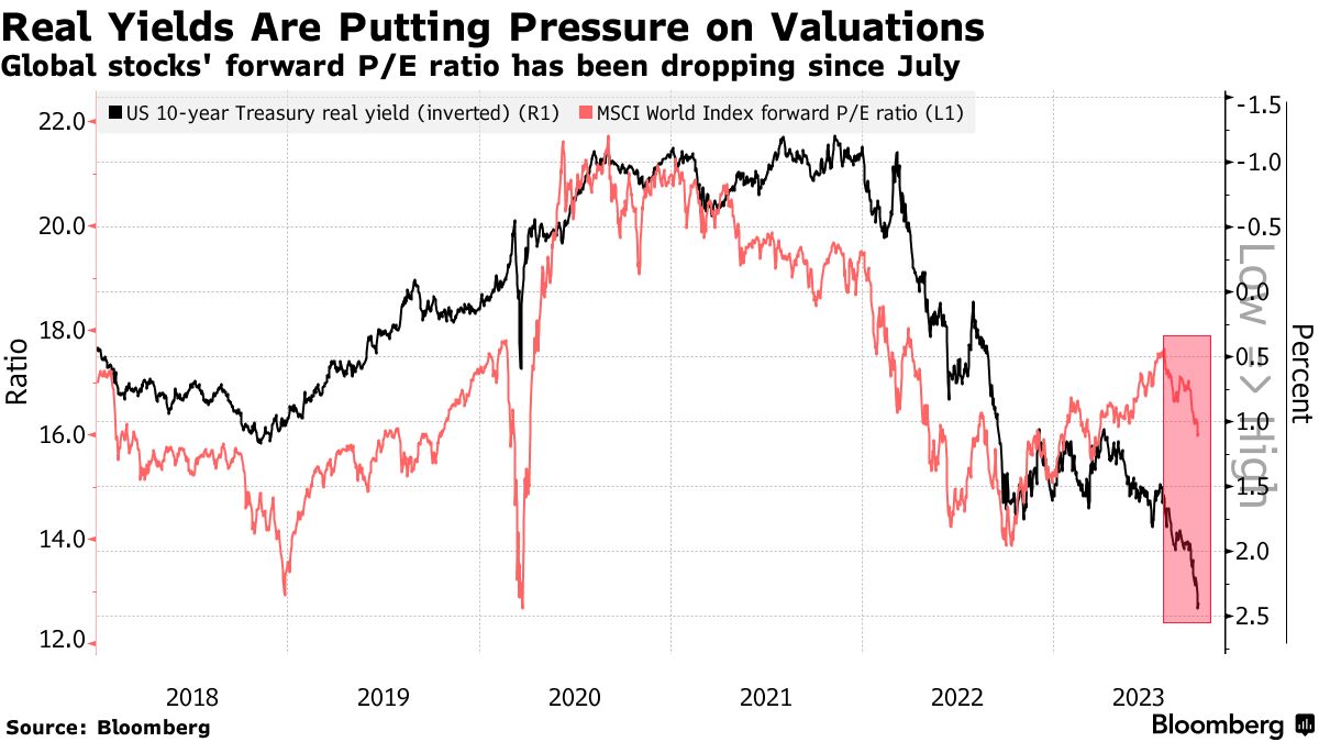 与此同时,衡量股票和债券预期回报之差的股票风险溢价指标正受到急剧挤压,促使投资者撤出股市。来自巴克莱银行的策略师Emmanuel Cau表示:“在未来利率长期较高水平的基准情形之下,估值水平变动对于股票市场投资者来说显得更加重要。”