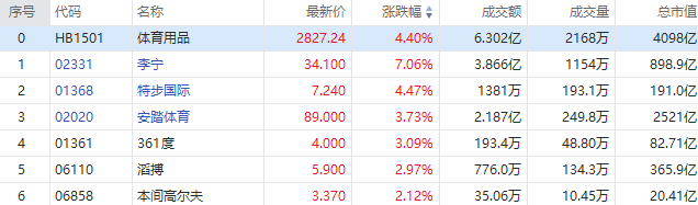 10月11日,体育用品股午后涨幅进一步扩大,截至发稿,李宁涨7.06%,报34.1港元;特步国际涨4.47%,报7.24港元;安踏体育涨3.73%,报89港元;361度涨3.09%,报4港元;滔搏等跟涨。