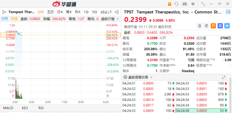 生物技术公司Tempest $TPST 飙涨266%,消息面上,Tempest Therapeutics于10日发布新闻稿,表示将于11日盘前报告 TPST-1120 一线肝细胞癌全球随机组合研究的新数据和更新数据,并进行电话会议直播。
