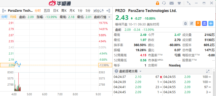 无人机公司ParaZero Technologies Ltd $PRZO 走低跌超13%,此前该公司宣布澳大利亚监管机构批准在人口稠密的地区和使用ParaZero安全系统的人附近进行首次商用无人机飞行。