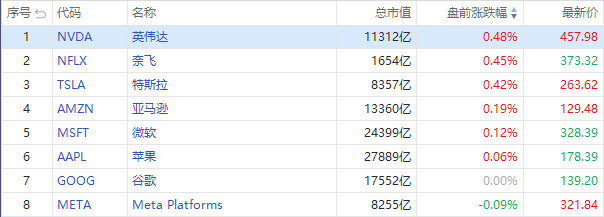 热门科技股盘前微涨,英伟达 $NVDA 、奈飞 $NFLX 、微软 $MSFT 、亚马逊 $AMZN 、苹果 $AAPL 、特斯拉 $TSLA 小幅上涨。