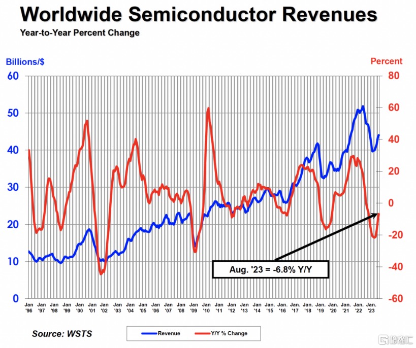 据半导体行业协会(SIA)最新统计数据,8月全球半导体销售额环比增长1.9%,达到440亿美元。连续6个月环比上涨,预计今后将继续保持增长趋势。不过,2023年8月全球半导体产业销售额仍较去年同期仍减少6.8%,但降幅创下2022年10月以来新低。