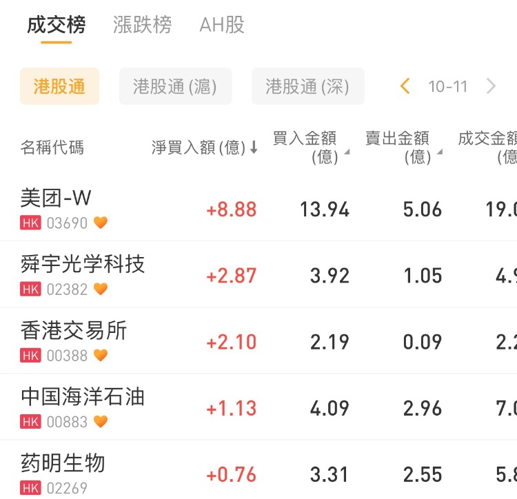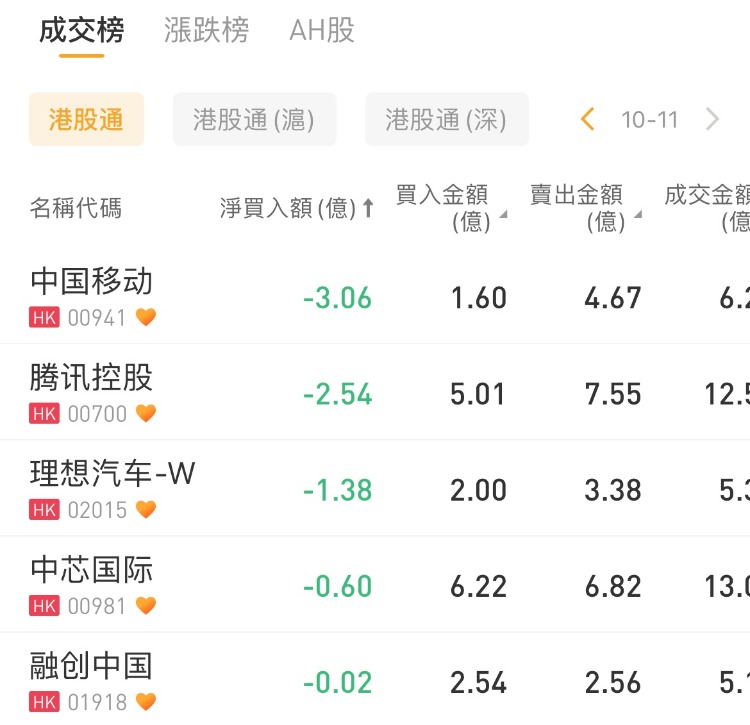 美团-W、舜宇光学科技、香港交易所分别获净买入8.88亿港元、2.87亿港元、2.1亿港元;中国移动净卖出额居首,金额为3.06亿港元,沽出腾讯控股2.54亿港元。