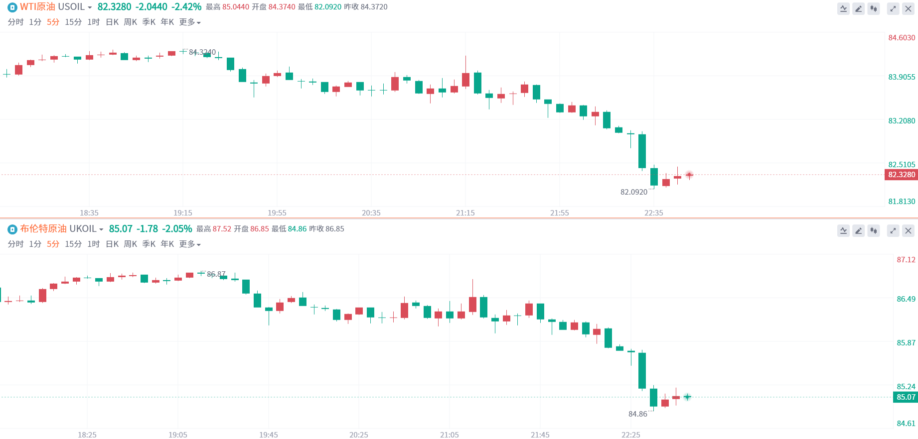周三,尽管俄罗斯总理普京暗示很有可能会继续延长欧佩克+的减产协议,但由于以色列和哈马斯的冲突对石油流量的影响仍然有限,油价有所回落。WTI原油失守85美元/桶的水平,日内跌超2%,并在美盘时段一度跌至82美元附近。布伦特原油一度跌破85美元。