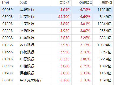 受利好消息影响,内银股早盘集体发力上涨,截至发稿,建设银行、招商银行涨近5%,工商银行涨超4%,交通银行、中国银行、农业银行、邮储银行等涨超3%,中信银行、民生银行等涨超2%。