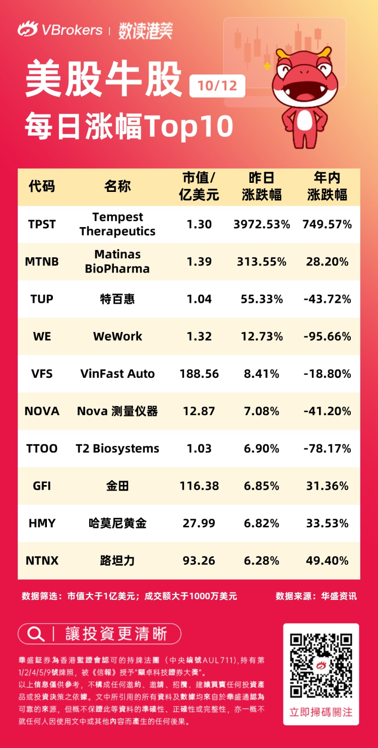 發仔梳理了每日美股涨幅Top10榜单,以下为隔夜美股涨幅靠前的个股:
