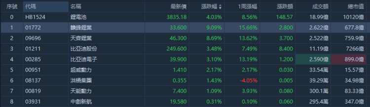 锂电股继续走高,截至发稿,赣锋锂业涨超9%;天齐锂业涨8.69%;比亚迪电子涨3.10%;超威动力涨2.17%。