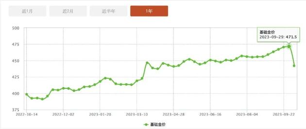 黄金资产开始下跌核心原因是金价掉下来了。近两年,由于宏观环境的不确定性以及经济复苏的不明朗,作为避险资产的代表,金价连涨了21个月,价格十分坚挺。以2022年10月14日到2023年9月这段时间为例,国内基础金价从不到400元/克上升到472元/克,不到一年时间,金价涨了20%。