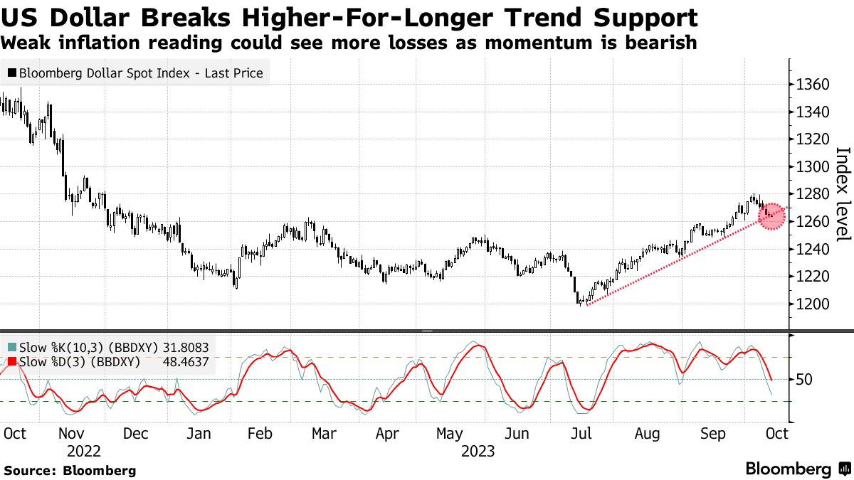 彭博美元指数连续第七个交易日下跌,此前美联储官员包括沃勒(Christopher Waller)表示可能会避免进一步收紧政策,这一系列评论引发了市场的关注。2023年美元的涨势让交易员们大吃一惊,他们在年初预测美元将因美国经济的例外主义逐渐消退而下跌,但该指数在过去两个季度连续上涨,并在上周达到近一年来的最高水平,因为市场预期美国利率可能会保持较高水平更长时间。