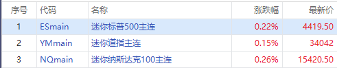 华盛资讯10月12日消息,美股三大期指小幅上涨,截至发稿,纳指期货 $NQmain 现涨0.26%,标普500指数期货 $ESmain 涨0.22%,道指期货 $YMmain 涨0.15%。