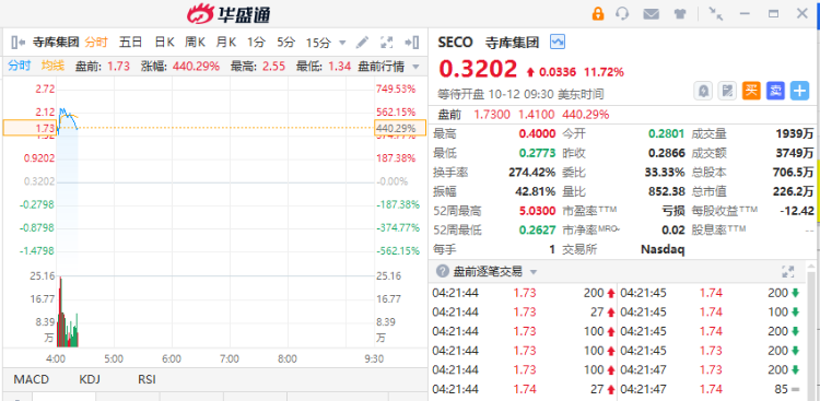 中概股寺库集团 $SECO 盘前涨超440%,现报1.73美元每股。