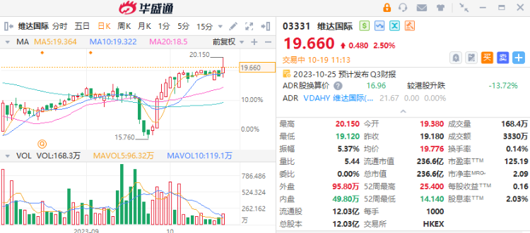 10月19日消息,维达国际早盘一度涨超4%,截至发稿,股价报19.66港元每股,成交额3330万港元。