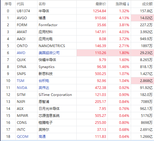 华盛资讯10月12日消息,美股半导体板块异动走高,3倍做多半导体指数ETF $SOXL 涨超5%;应用材料 $AMAT 、博通 $AVGO 涨超4%,应用光电 $AAOI 涨超3%, $ONTO 涨超2%, $AMD 、台积电 $TSM 涨超1%、英伟达 $NVDA 涨近1%;高通 $QCOM 跟涨。