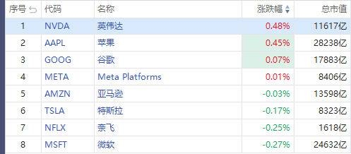 热门科技股涨跌分化,其中英伟达 $NVDA 、谷歌 $GOOG 、亚马逊 $AMZN 、meta $META 、苹果 $AAPL 小幅上涨;特斯拉 $TSLA、奈飞 $NFLX 、微软 $MSFT 小幅下跌。