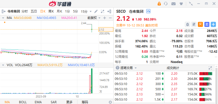 中概股寺库集团 $SECO 涨超562%,现报2.12美元每股。