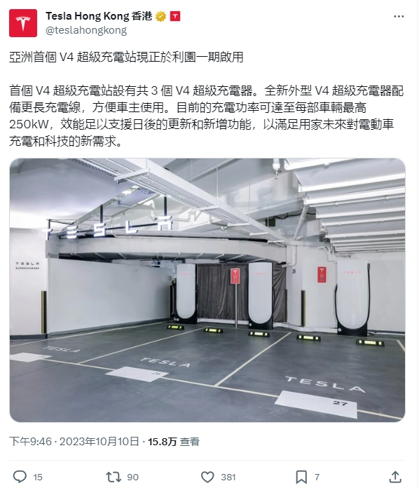 特斯拉现已确认,亚洲首个 V4 超充站正式在香港落地。该超充站位于铜锣湾的利园一期,现已正式启用。
