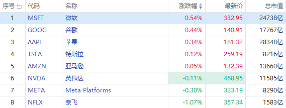 热门科技股涨跌分化,其中微软 $MSFT 、谷歌 $GOOG 、苹果 $AAPL 、特斯拉 $TSLA、亚马逊 $AMZN 小幅上涨;英伟达 $NVDA 、meta $META 、奈飞 $NFLX 、小幅下跌。