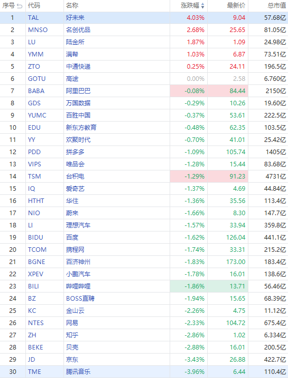 京东 $JD 、腾讯音乐 $TME 跌超3%,贝壳 $BEKE 、知乎 $ZH 、网易 $NTES 跌超2%;爱奇艺 $IQ 、哔哩哔哩 $BILI 、拼多多 $PDD 、百度 $BIDU 跌超1%,阿里巴巴 $BABA 小幅下跌;名创优品 $MNSO 涨超2%。