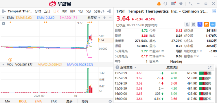 4、一度暴涨近4000%后,美股肿瘤医药公司Tempest $TPST 股价遭“膝盖斩”